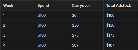 Here’s how I understood it: let’s say you spend $100 on display ads during the week. A customer might see those ads on Sunday — and still remember them the next week. That memory decays, though. So we apply a constant (say 50%) to indicate how much of last week’s effect carries over.
