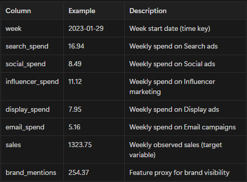 Created data — Because real MMM data is proprietary, I simulated my own. This gave me control and flexibility while learning.